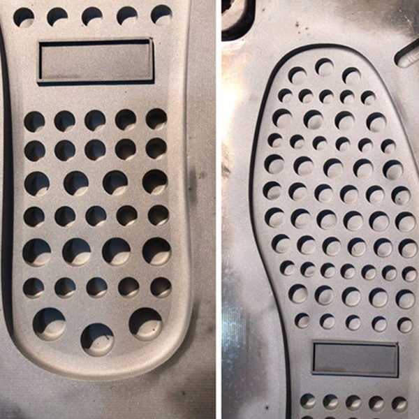 | 2) It is used on the TR moulding machine, such as Italian machine, Kingrich TR machine, Main Group TR vertical machine. The struct of the mould is according to the sole samples, the size usually is 400mm*300mm*120mm. This mould is made of Aluminum. |